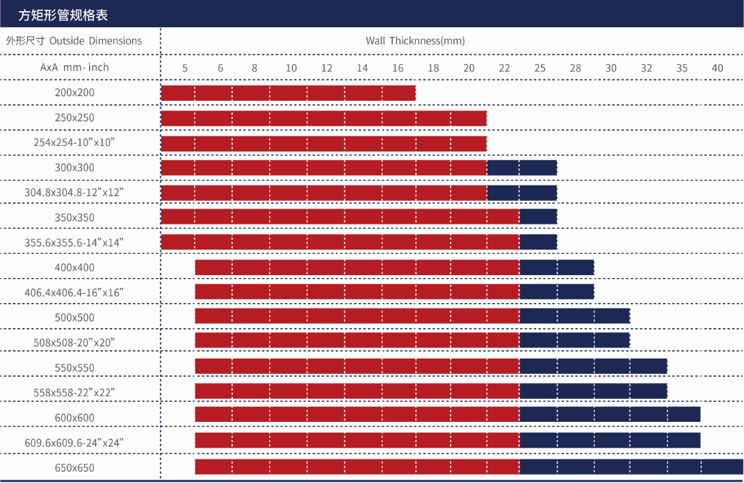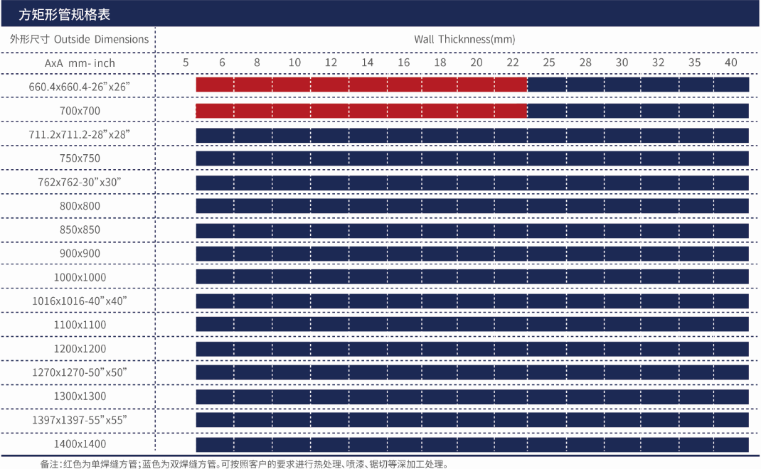 我公司通過自主設(shè)計(jì)研發(fā),擁有了國內(nèi)首條大口徑單縫方矩管生產(chǎn)線,可以生產(chǎn)規(guī)格200*200-700*700的單縫直縫埋弧焊接方矩形管,壁厚范圍5-22mm;雙焊縫埋弧焊接方矩形管最大尺寸可到1400*1400mm,壁厚達(dá)40mm。該產(chǎn)品因外形尺寸精度高,焊縫強(qiáng)度大燈特點(diǎn)被廣泛應(yīng)用于鋼結(jié)構(gòu)、橋梁基建、船舶制造等領(lǐng)域。
